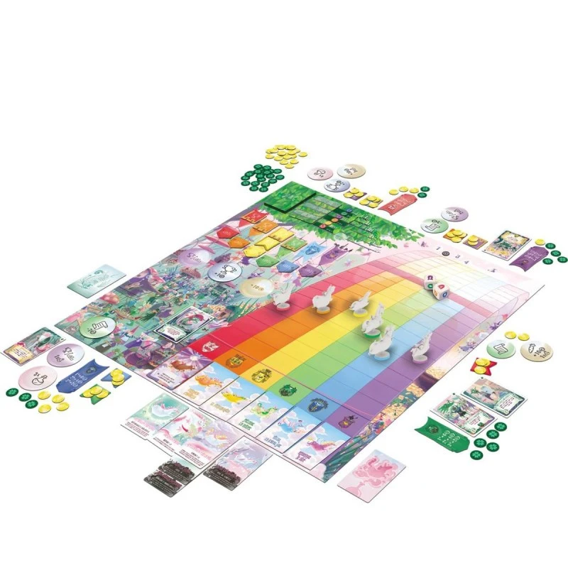 Contenu : 1 plateau de jeu, 123 cartes, 6 figurines de Licornes, 6 socles, 2 dés Sprint, 1 jeton Premier Joueur, 6 jetons Pari Gagnant, 6 jetons Pari Placé Anticipé, 6 jetons Pari Placé Tardif, 11 jetons Action, 81 jetons Gloire, 6 jetons Cote, 6 tuiles Propriétaire, 1 marqueur Décompte des Courses, 124 jetons Or et 1 livret de règles.