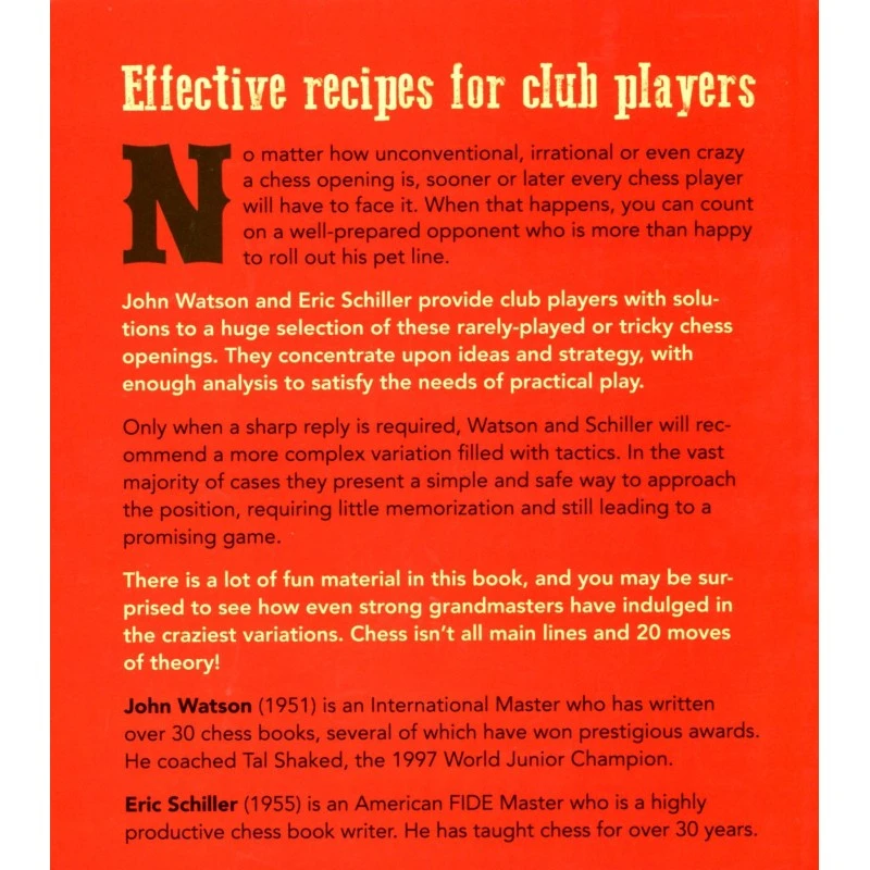 Watson & Schiller – Taming Wild Chess Openings. How to Deal with the Good, the Bad and the Ugly over the Chess Board. Oui, je sais : un des auteurs inspire confiance, l’autre moins… Quoi qu’il en soit, ce livre est consacré à toutes les ouvertures excentriques, baroques et/ou absurdes (mais pas forcément toutes mauvaises, ceci dit) qui ont un jour ou l’autre éclos sur un échiquier, et à la façon de les mater. Oui, enfin ça, c’est le titre qui l’affirme… Bref, si vous avez eu un jour des difficultés avec la défense guatémaltèque, le mokélé mbembé ou la néo-mongoloïde, voici pour vous.