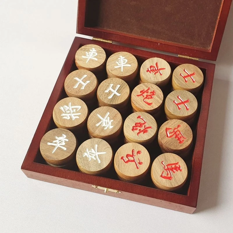 Pièces de XiangQi, également appelé Jeu d’échecs Chinois, en bois de gaiac massif. Ensemble complet de pièces traditionnelles. Chaque pièce mesure environ 2.8cm de diamètre.